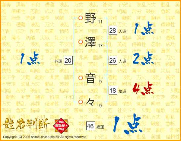 生活面を象徴する運勢です。外部から受ける影響力を表し、結婚運、家庭運や職場、環境への順応性を表します。総運から人運を引いた画数。姓や名が1文字の場合を除く。