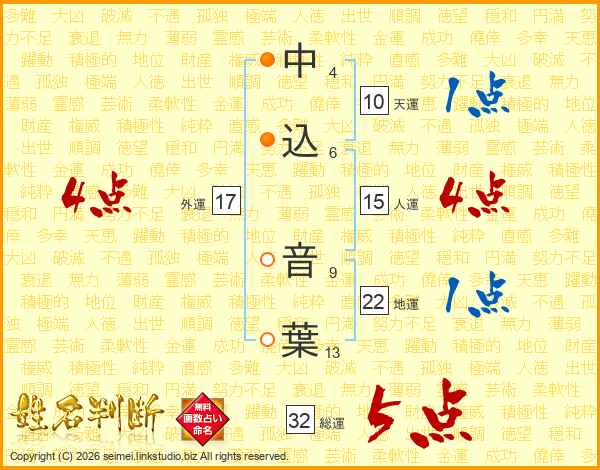 生活面を象徴する運勢です。外部から受ける影響力を表し、結婚運、家庭運や職場、環境への順応性を表します。総運から人運を引いた画数。姓や名が1文字の場合を除く。