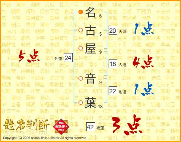 名(6画)古(5画)屋(9画) 音(9画)葉(13画)