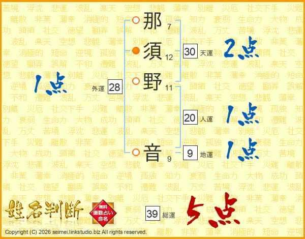 那須野音さんの総運は39画の5点!