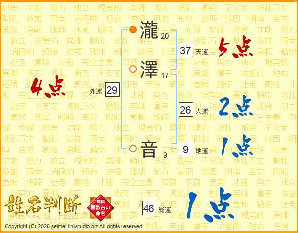 瀧(20画)澤(17画) 音(9画)