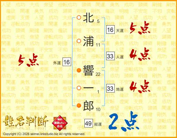 北(5画)浦(11画) 響(22画)一(1画)郎(10画)