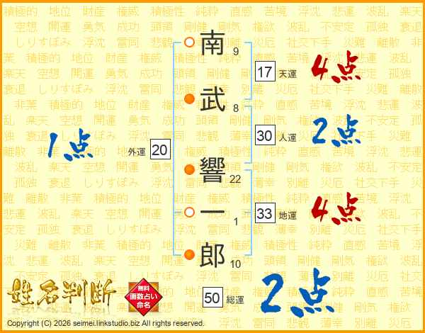 南(9画)武(8画) 響(22画)一(1画)郎(10画)