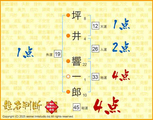 坪(8画)井(4画) 響(22画)一(1画)郎(10画)