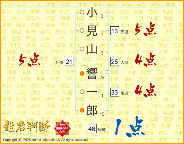 小(3画)見(7画)山(3画) 響(22画)一(1画)郎(10画)