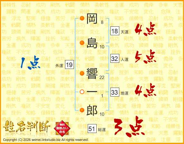 岡(8画)島(10画) 響(22画)一(1画)郎(10画)