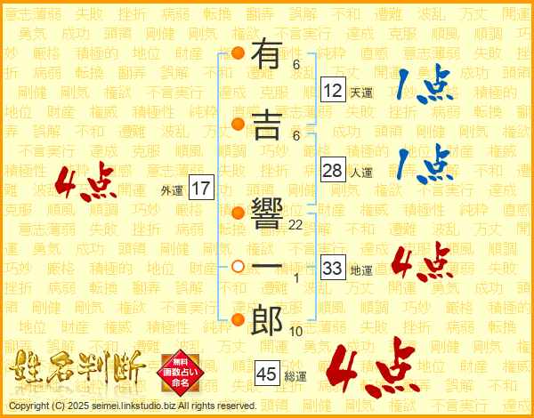 有(6画)吉(6画) 響(22画)一(1画)郎(10画)