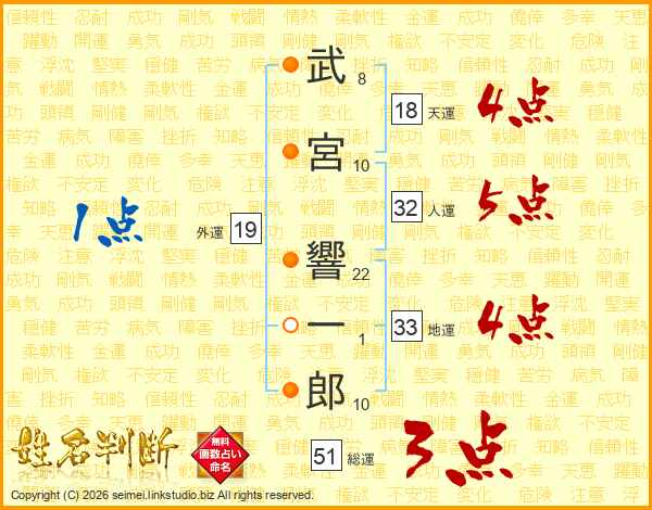武(8画)宮(10画) 響(22画)一(1画)郎(10画)