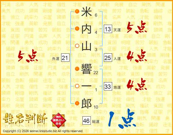 米(6画)内(4画)山(3画) 響(22画)一(1画)郎(10画)