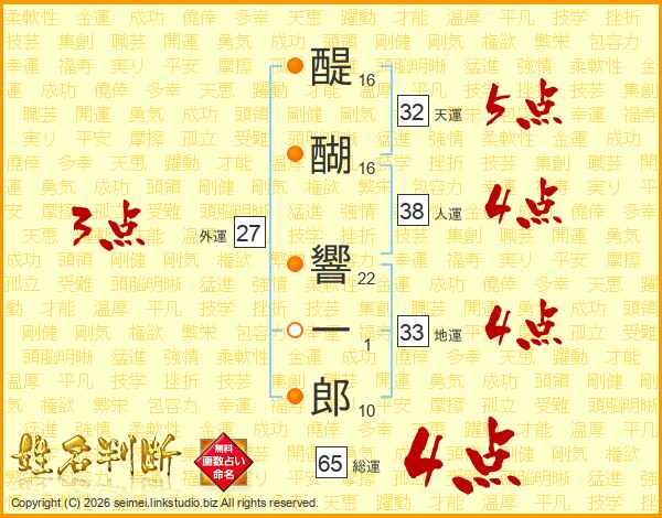 醍醐響一郎さんの総運は65画の4点!