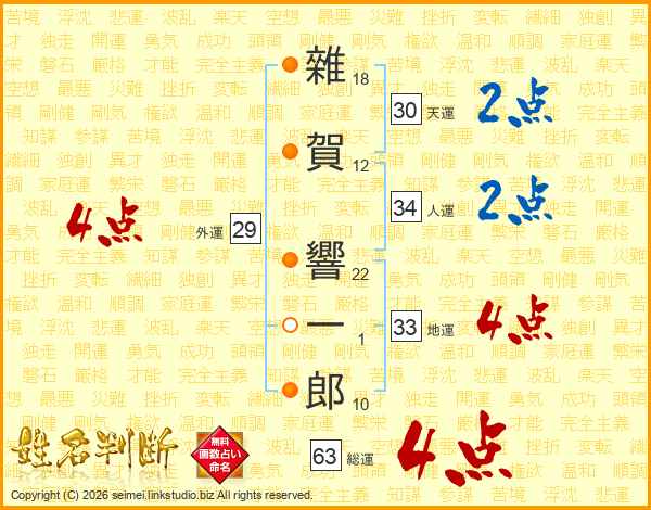雜(18画)賀(12画) 響(22画)一(1画)郎(10画)