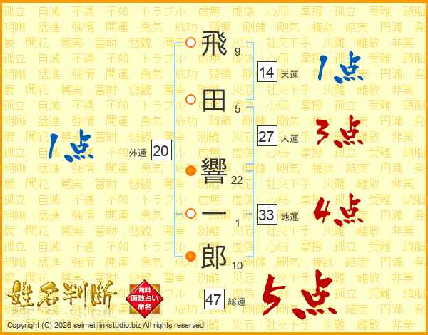 飛(9画)田(5画) 響(22画)一(1画)郎(10画)