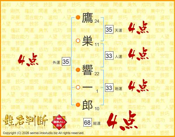鷹巣響一郎さんの総運は68画の4点!