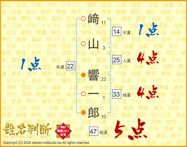 﨑(11画)山(3画) 響(22画)一(1画)郎(10画)