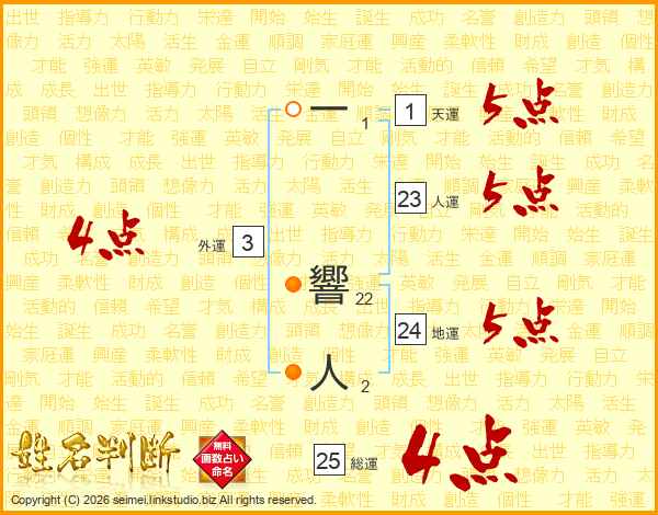 生活面を象徴する運勢です。外部から受ける影響力を表し、結婚運、家庭運や職場、環境への順応性を表します。総運から人運を引いた画数。姓や名が1文字の場合を除く。