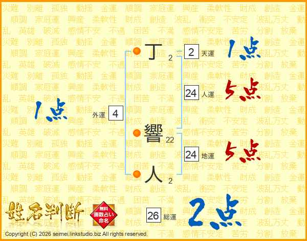 生活面を象徴する運勢です。外部から受ける影響力を表し、結婚運、家庭運や職場、環境への順応性を表します。総運から人運を引いた画数。姓や名が1文字の場合を除く。