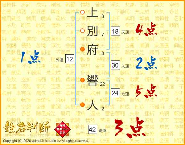 上(3画)別(7画)府(8画) 響(22画)人(2画)