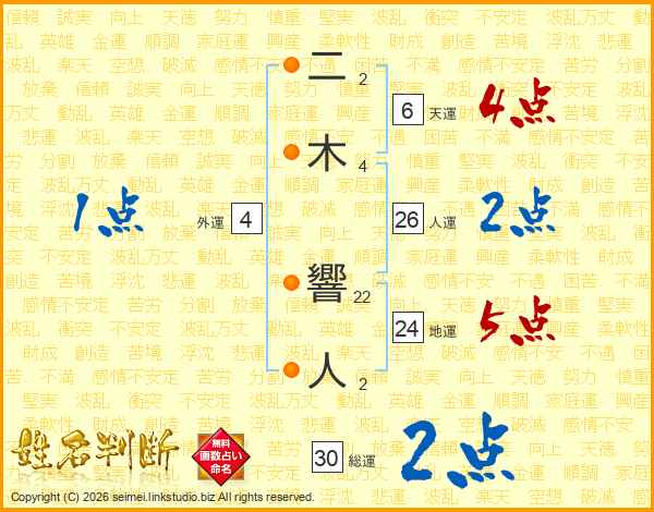 二木響人さんの人運は26画の2点!
