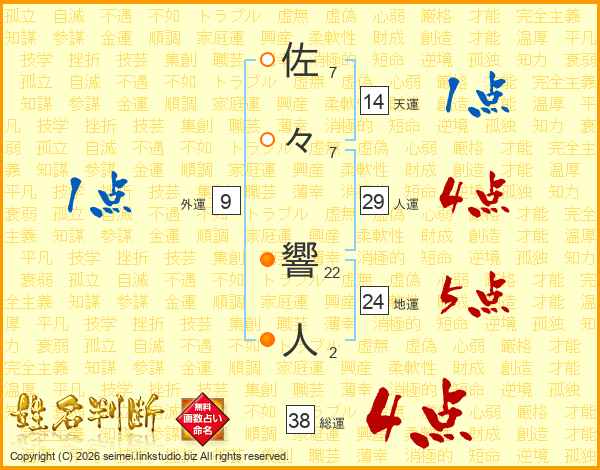 佐々響人さんの総運は38画の4点!