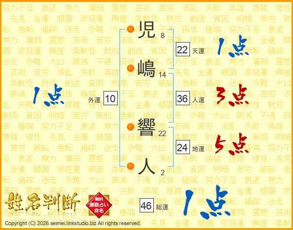 生活面を象徴する運勢です。外部から受ける影響力を表し、結婚運、家庭運や職場、環境への順応性を表します。総運から人運を引いた画数。姓や名が1文字の場合を除く。