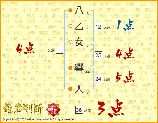 八(8画)乙(1画)女(3画) 響(22画)人(2画)