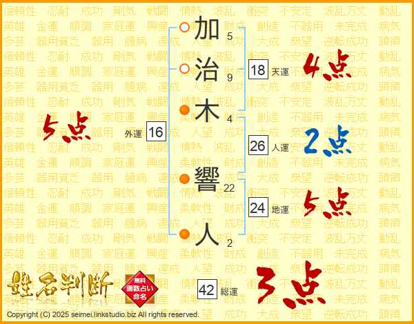 加(5画)治(9画)木(4画) 響(22画)人(2画)