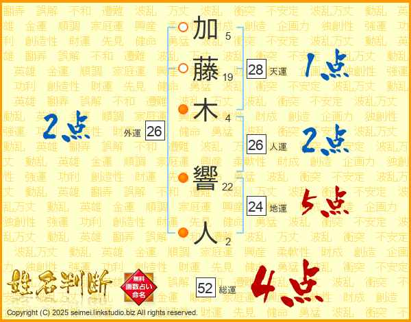 加(5画)藤(19画)木(4画) 響(22画)人(2画)