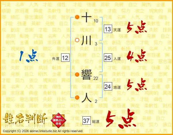 生活面を象徴する運勢です。外部から受ける影響力を表し、結婚運、家庭運や職場、環境への順応性を表します。総運から人運を引いた画数。姓や名が1文字の場合を除く。