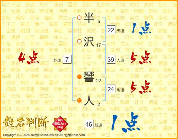半沢響人さんの人運は39画の5点!