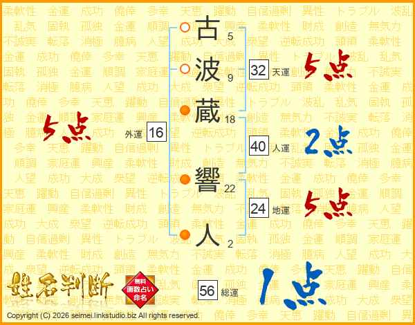 古(5画)波(9画)蔵(18画) 響(22画)人(2画)