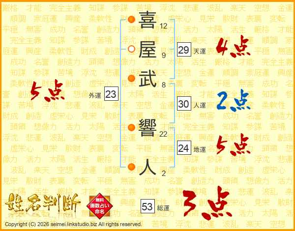 喜(12画)屋(9画)武(8画) 響(22画)人(2画)