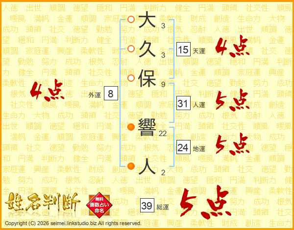 大(3画)久(3画)保(9画) 響(22画)人(2画)