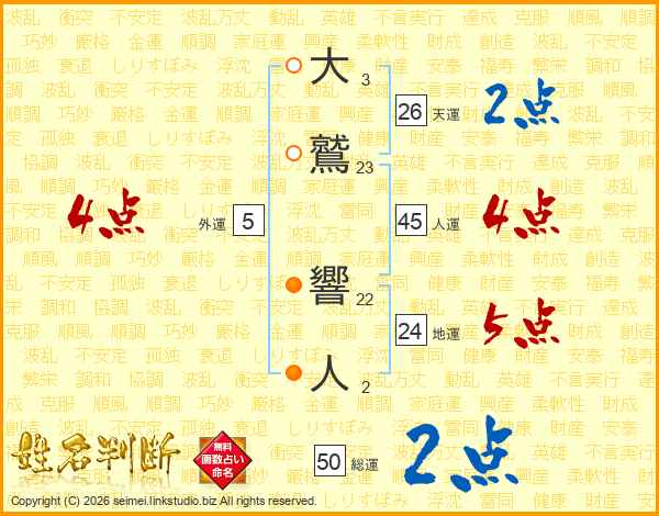 生活面を象徴する運勢です。外部から受ける影響力を表し、結婚運、家庭運や職場、環境への順応性を表します。総運から人運を引いた画数。姓や名が1文字の場合を除く。