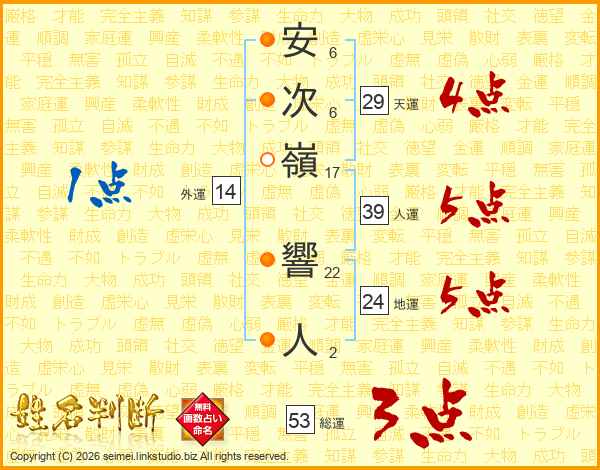 安次嶺響人さんの人運は39画の5点!