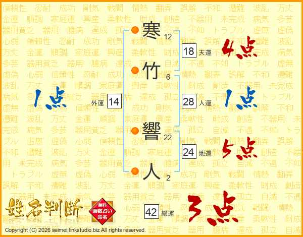 寒竹響人さんの総運は42画の3点!