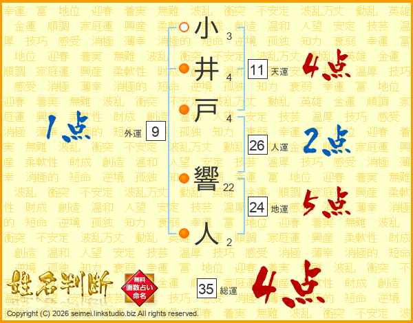 小(3画)井(4画)戸(4画) 響(22画)人(2画)