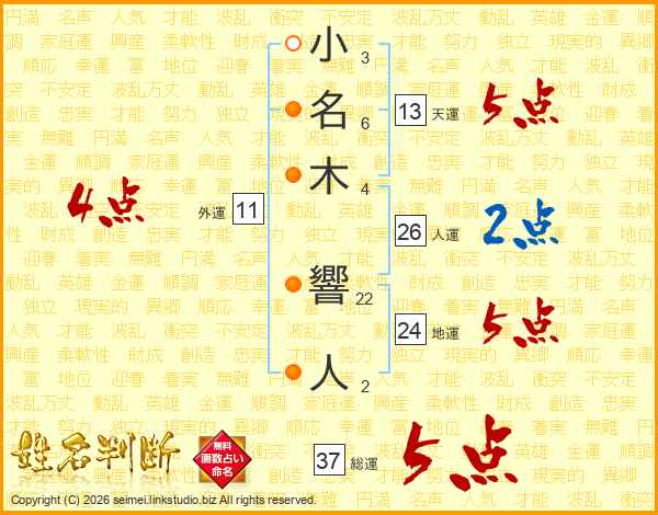 小名木響人さんの人運は26画の2点!