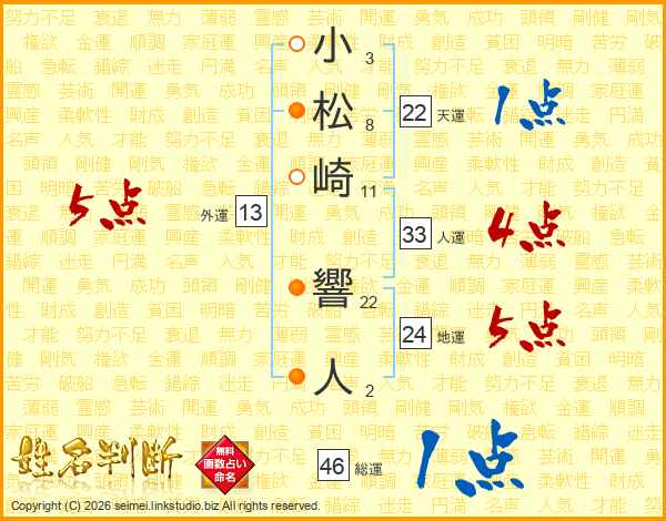 小(3画)松(8画)崎(11画) 響(22画)人(2画)