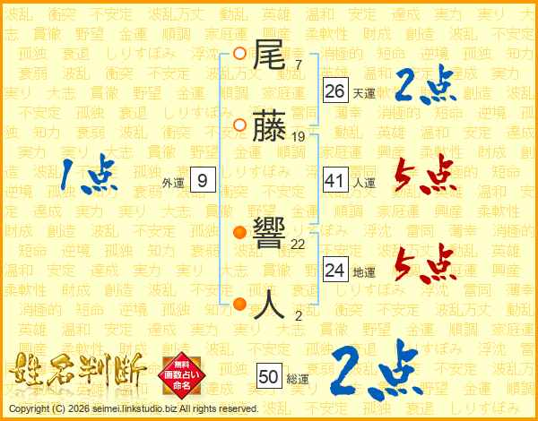 生活面を象徴する運勢です。外部から受ける影響力を表し、結婚運、家庭運や職場、環境への順応性を表します。総運から人運を引いた画数。姓や名が1文字の場合を除く。