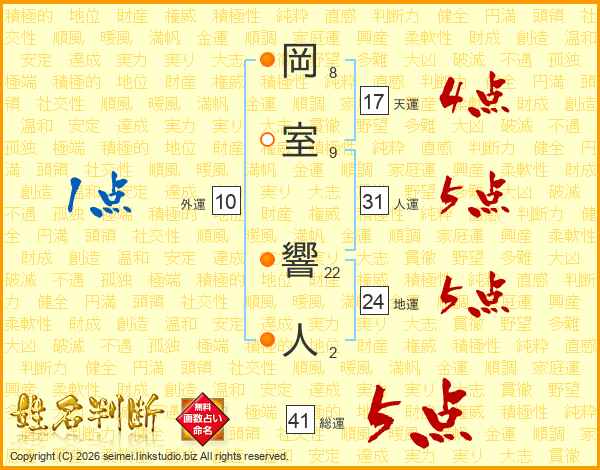 生活面を象徴する運勢です。外部から受ける影響力を表し、結婚運、家庭運や職場、環境への順応性を表します。総運から人運を引いた画数。姓や名が1文字の場合を除く。