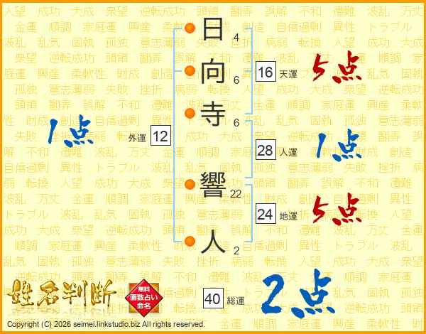 日(4画)向(6画)寺(6画) 響(22画)人(2画)