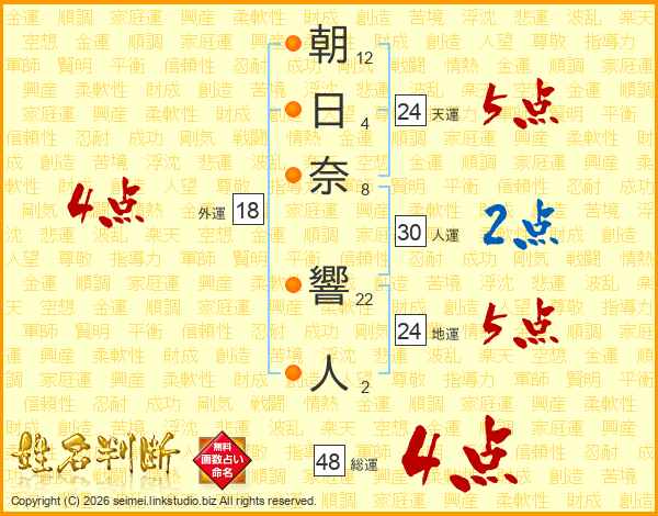 朝(12画)日(4画)奈(8画) 響(22画)人(2画)