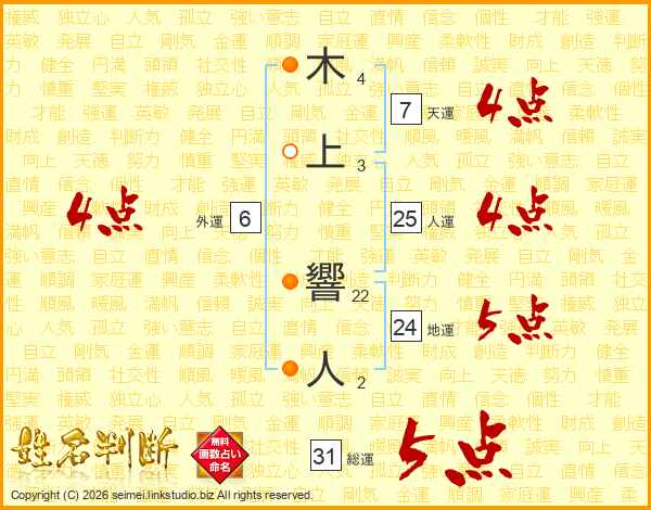 生活面を象徴する運勢です。外部から受ける影響力を表し、結婚運、家庭運や職場、環境への順応性を表します。総運から人運を引いた画数。姓や名が1文字の場合を除く。