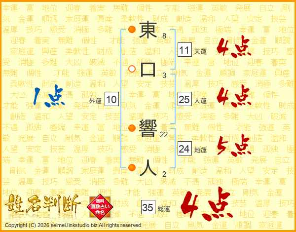 生活面を象徴する運勢です。外部から受ける影響力を表し、結婚運、家庭運や職場、環境への順応性を表します。総運から人運を引いた画数。姓や名が1文字の場合を除く。