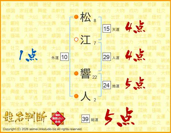 松江響人さんの総運は39画の5点!