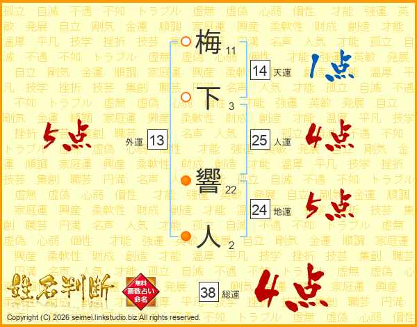 梅下響人さんの総運は38画の4点!