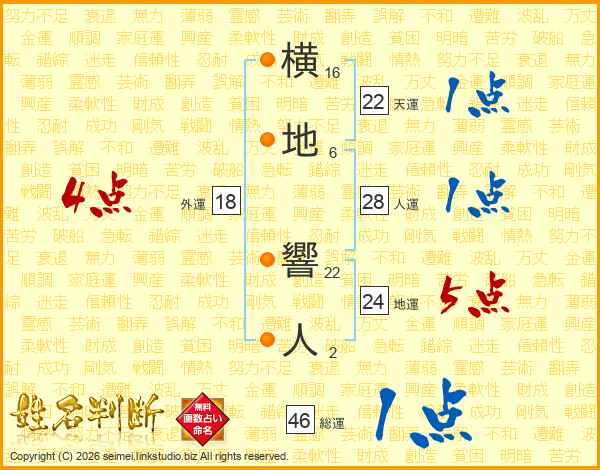 横(16画)地(6画) 響(22画)人(2画)