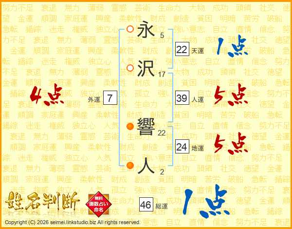 永沢響人さんの人運は39画の5点!