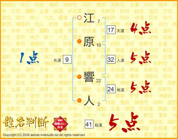 生活面を象徴する運勢です。外部から受ける影響力を表し、結婚運、家庭運や職場、環境への順応性を表します。総運から人運を引いた画数。姓や名が1文字の場合を除く。