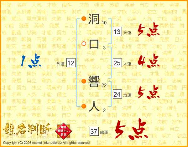 生活面を象徴する運勢です。外部から受ける影響力を表し、結婚運、家庭運や職場、環境への順応性を表します。総運から人運を引いた画数。姓や名が1文字の場合を除く。